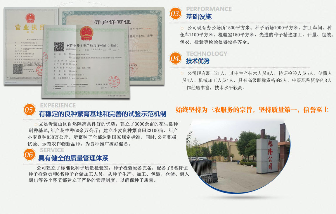 公司具有健全的質量管理體系,較強的技術力量,并建立了標準化種子質量檢驗室,種子檢驗設備齊全。配有良好的基礎設施和種子生產加工設備,有穩定的良種繁育基地和完善的試驗示范機制。現有職工21人,工作經驗豐富,技術水平較高。多年來,始終堅持為三農服務的宗旨,堅持質量第一,信譽至上的經營方針,以優質的服務和過硬的種子質量嬴得了廣大農民朋友的認可。為促進當地農業發展作出了一定的貢獻。